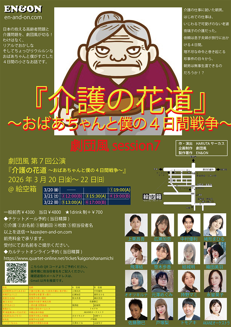 ①介護 ②お名前 ③観劇回 ④枚数 ⑤担当役者名 以上を送信→ kaze@en-and-on.com 前売料金で承ります。 受付にてお名前をご提示ください。
